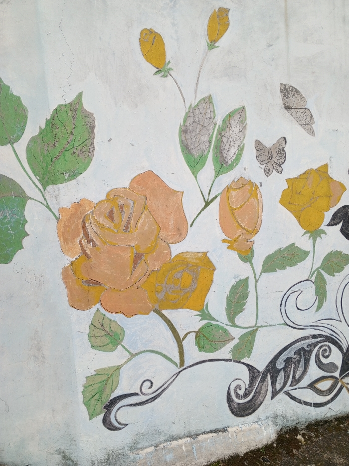 The image displays a close-up of a weathered mural painted on a light-colored wall in Voa Yeav, Cambodia. The primary subjects are yellow and orange roses, including several full blooms and buds, depicted with green leaves. Some leaves exhibit a faded or textured grey appearance. Two grey butterflies are painted in the upper right section. A decorative, swirling pattern in black and grey occupies the lower right quadrant. The wall itself shows multiple cracks, and the paint is visibly peeling and distressed. A dark, possibly damp stain is present along the bottom edge of the wall. No people or active interactions are visible.