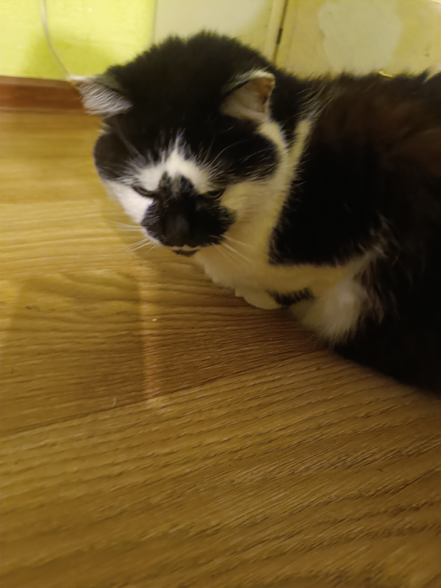 A bicolored cat, primarily black with significant white markings on its face, chest, and paws, rests on a wooden floor. The cat's eyes are closed. Its face exhibits a black nose and mouth surrounded by white fur, with a white blaze extending up between its eyes. White whiskers are visible. The background consists of a light yellow-green wall or vertical surface, with a darker brown horizontal strip, likely a baseboard, separating it from the floor. The floor is composed of light to medium brown wooden planks with distinct grain patterns. The scene is located indoors, in the city of Unknown, Unknown.