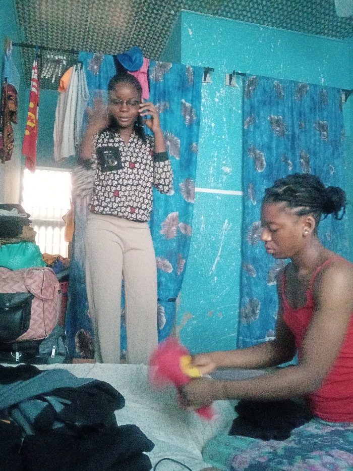 Two young women occupy a blue-toned room. The woman on the left stands, wearing glasses, a patterned blouse, and light-colored pants, talking on her phone. To her right, a window and hanging clothes are visible. The woman on the right sits, wearing a red tank top and dark shorts, focused on a pink object in her hands. Baggage and scattered clothing add to the room's lived-in appearance. Blue curtains hang behind both women, complementing the blue walls and ceiling.