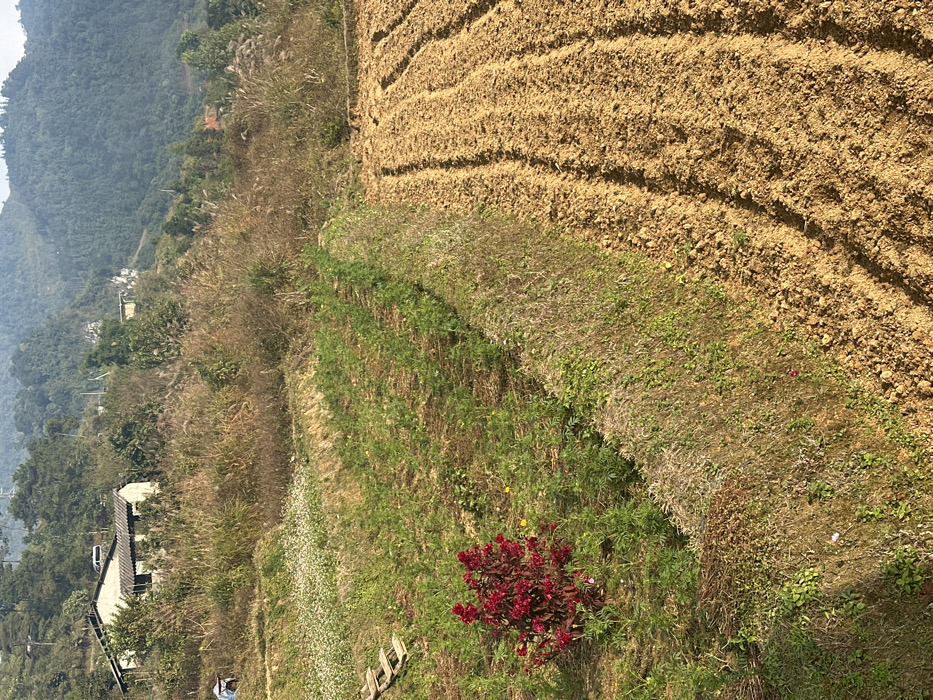 The image displays a terraced agricultural landscape on a hillside within Minh Tân Commune, Vietnam. The foreground on the right consists of light brown, freshly tilled soil with prominent parallel furrows. To the left, a lower agricultural terrace contains rows of green crops. Within this terrace, a dense bush of dark red, plume-like flowers is visible, alongside scattered smaller yellow and pink blooms. Above this, another terrace features a field of small white flowers and green foliage. A rustic wooden ladder or steps is partially visible on the far left. The midground shows an upward-sloping hillside covered in dry, tall grasses and various shrubs. Two single-story structures with light-colored walls and dark roofs are situated on this slope; a white vehicle is partially visible near the leftmost building. A third, smaller structure is higher and to the right. The background features heavily forested mountains under a hazy sky. No individuals or animals are present in the scene.
