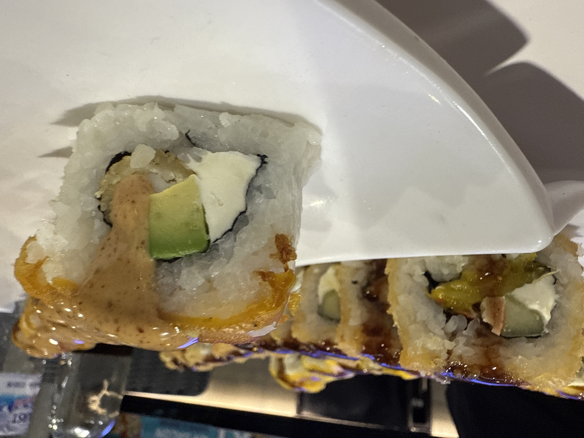The image displays a close-up of several sushi rolls presented on a white rectangular ceramic plate. The scene is set indoors, likely within a restaurant in Puebla, Mexico. In the foreground, a single sushi roll is positioned on the right side of the plate, partially obscuring other rolls. This roll features a white rice exterior wrapped around a core containing a light green avocado slice, a white cream cheese-like substance, and a textured, light brown component suggesting a fried element. The top of this roll is covered with a thick, speckled, orange-brown sauce that partially drips down its sides. In the mid-ground, a line of several additional sushi rolls extends diagonally from the center-left towards the upper right, appearing out of focus. These rolls are encased in a golden-brown, crisp-looking exterior, indicative of being deep-fried or tempura-battered. They are drizzled with a dark, glossy sauce, possibly teriyaki or unagi sauce. Visible fillings within these rolls include white cream cheese and a distinct yellowish-green ingredient, possibly a pickled vegetable. The background is dark and blurred, suggesting an indoor environment. Visible elements include a reflective, metallic object, possibly a shaker or dispenser, on the right. Further back, a segment of a blue-lit surface is discernible, alongside a light-colored object displaying the numbers "67." The plate exhibits a subtle raised edge on its left side. No individuals are visible in the scene.