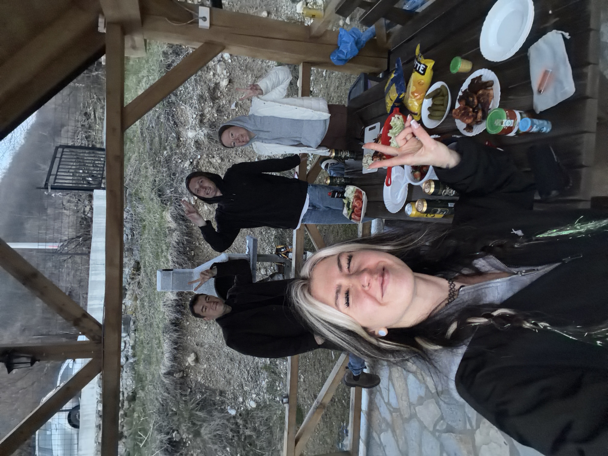 Four people are gathered in an open-sided wooden structure, possibly a gazebo, on a stone-tiled surface. A woman in the foreground is holding the camera and smiling, with dark hair streaked with white. To her left and slightly behind is a man wearing a black jacket, holding up a peace sign. Further to the left and behind him is a man in a white jacket, also holding up a peace sign. Another man in a black jacket is positioned between the two. On the wooden table to the right, there are plates, bowls, snacks, drinks, and a bag of chips. The background reveals a mountainous terrain with vegetation, possibly near Gusinje, Montenegro.