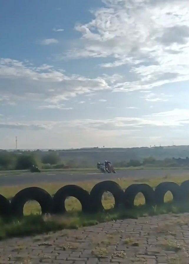 two motorcyclists speeding along a racetrack, as viewed from behind a tire barrier. The sky above is blue with scattered clouds. The landscape in the background is a mix of fields and some buildings. The camera is relatively stable, providing a clear view of the speeding motorcycles as they navigate a turn on the track.