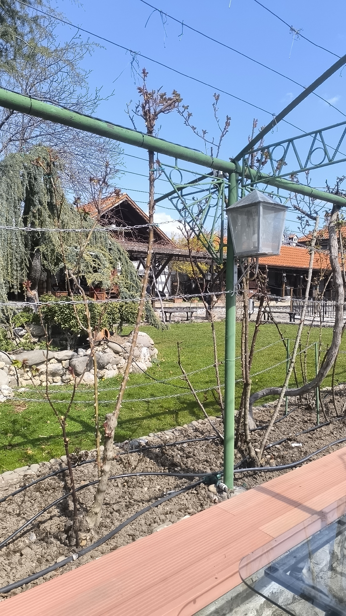 The scene depicts an outdoor garden area within a property in Skobelevo, Bulgaria, under a clear, bright blue sky with minimal cloud cover, suggesting daytime conditions. In the immediate foreground, a reddish-brown, ribbed, flat surface, possibly a composite railing or ledge, occupies the bottom right. Directly above this, a green painted metal pergola or trellis system extends across the frame, supporting a silver-toned, rectangular outdoor lantern suspended by a chain. Numerous deciduous plants, largely defoliated or exhibiting nascent leaf growth, are trained along horizontal wires integrated into the trellis structure. At the base of these plants, a surface-level drip irrigation system with black tubing and a green hose connector is visible on brown soil. Mid-ground features an expanse of meticulously maintained green grass, bordered on the left by an arrangement of natural stones forming a low wall or rock garden, where a broken or overturned terracotta pot rests. Beyond the grassy area, an architectural complex with traditional design elements is present. Buildings feature prominent red tile roofs and dark-stained exposed timber framing. One structure includes an open-sided covered area furnished with multiple dark-colored wooden benches, suggesting an outdoor seating or dining space. Another building section exhibits white stucco walls with dark half-timbering. Various trees and shrubs are scattered throughout, including a large conifer with pendulous branches on the left, and other deciduous trees, some still bare, others showing early signs of budding. No individuals or active interactions are observed within the scene.