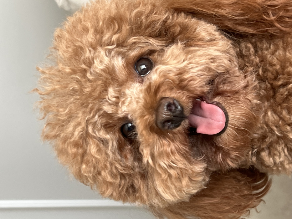 A close-up, headshot photograph depicts a single reddish-brown (apricot) poodle, consistent with a toy or miniature breed