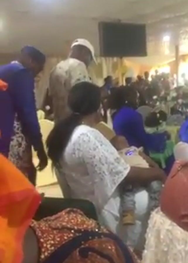 n indoor gathering of people, likely a party or celebration. People are seated on chairs while others stand and walk around. A woman is holding a baby. Some individuals are dressed in formal or traditional attire. The room appears to be a hall or event space with decorated elements. The people seem to be enjoying themselves.