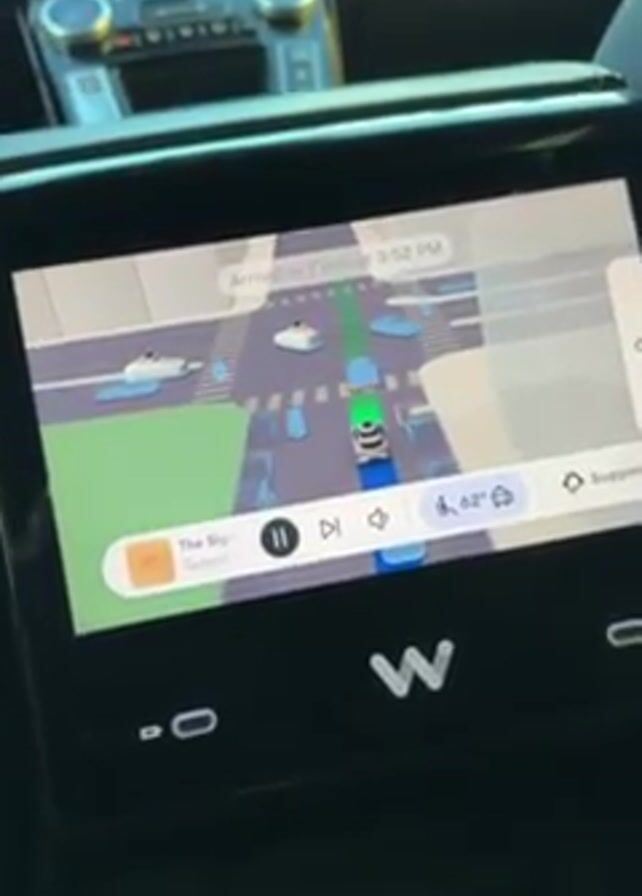 interior of a car, specifically the view from the back seat looking forward. A screen displays a navigation app with an estimated arrival time of 3:52 PM in 7 minutes. The app shows a cartoon representation of the car driving on a city street. The car itself is moving on a real street lined with buildings, visible through the windshield. The dashboard and center console are visible, featuring various buttons and displays. The front seats are dark gray or black leather. The sky outside is clear and sunny.