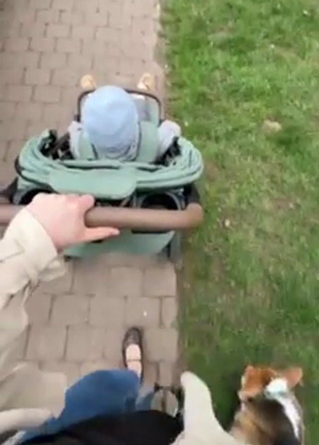 - ". The video is shot from a first-person perspective, showing a person pushing a baby stroller on a brick pathway. A baby with a light blue hat is lying in the stroller. A dog walks beside the person on a grass patch. The person wears jeans, black shoes, and a beige jacket. The stroller is light green with a brown handle and has a cup holder. The brick pathway is next to the grass patch. The overall setting seems to be outdoors. The video appears to be stable, indicating it was possibly recorded while walking." by FM-4GKkh1, licensed under CC BY 4.0
