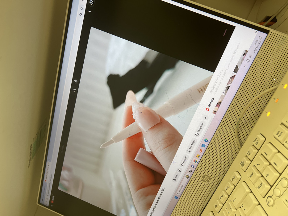 An HP laptop, light cream in color with a matching French QWERTY keyboard, is shown from an overhead perspective. The screen displays a YouTube video featuring a close-up of a hand with long, light pink/nude artificial nails, some adorned with small, textured embellishments. The hand holds a white, pointed, pen-like tool and a light pink cap. A strong, dark shadow is cast to the right within the video frame. The YouTube interface is visible, showing a video titled "nails, crystals and much more!" with "1.1K" likes and classified as "Shorts." Browser tabs indicate Google Chrome and YouTube. A system notification "Activer Windows" (Activate Windows) is present. The system clock shows "14:56" on "04/11/2023." The background above the laptop screen is a plain, light-colored wall with a faint barcode sticker. The scene is located in Casablanca, Morocco.