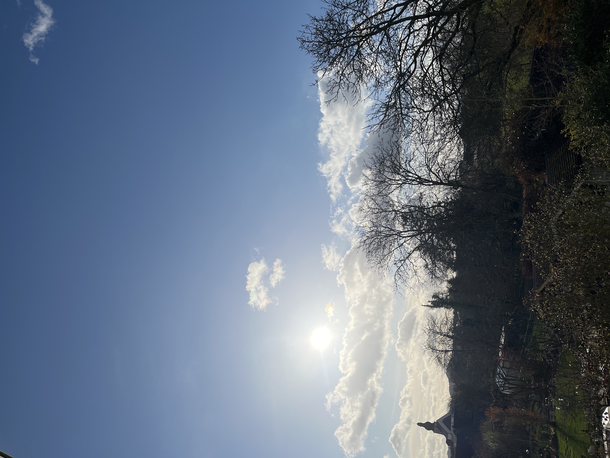 The image displays an outdoor landscape scene situated in Foetz, Luxembourg. The upper two-thirds of the frame feature a clear blue sky with a prominent, intensely bright sun positioned slightly left of center, partially obscured by scattered white cumulus clouds; some clouds exhibit iridescence. The lower third of the image is characterized by a mix of natural and semi-urban elements, primarily silhouetted due to backlighting. On the far left, a church steeple with a conical roof and a cross is visible, rising above distant structures. Below the horizon, a dense collection of bare deciduous trees and some evergreen foliage dominates the mid-ground. A small, transparent-paneled greenhouse structure is discernible amidst the trees. The immediate foreground consists of dark, dense vegetation, including shrubs and the upper portions of trees, partially obscuring the lower ground. No individuals or explicit actions are visible within the frame.