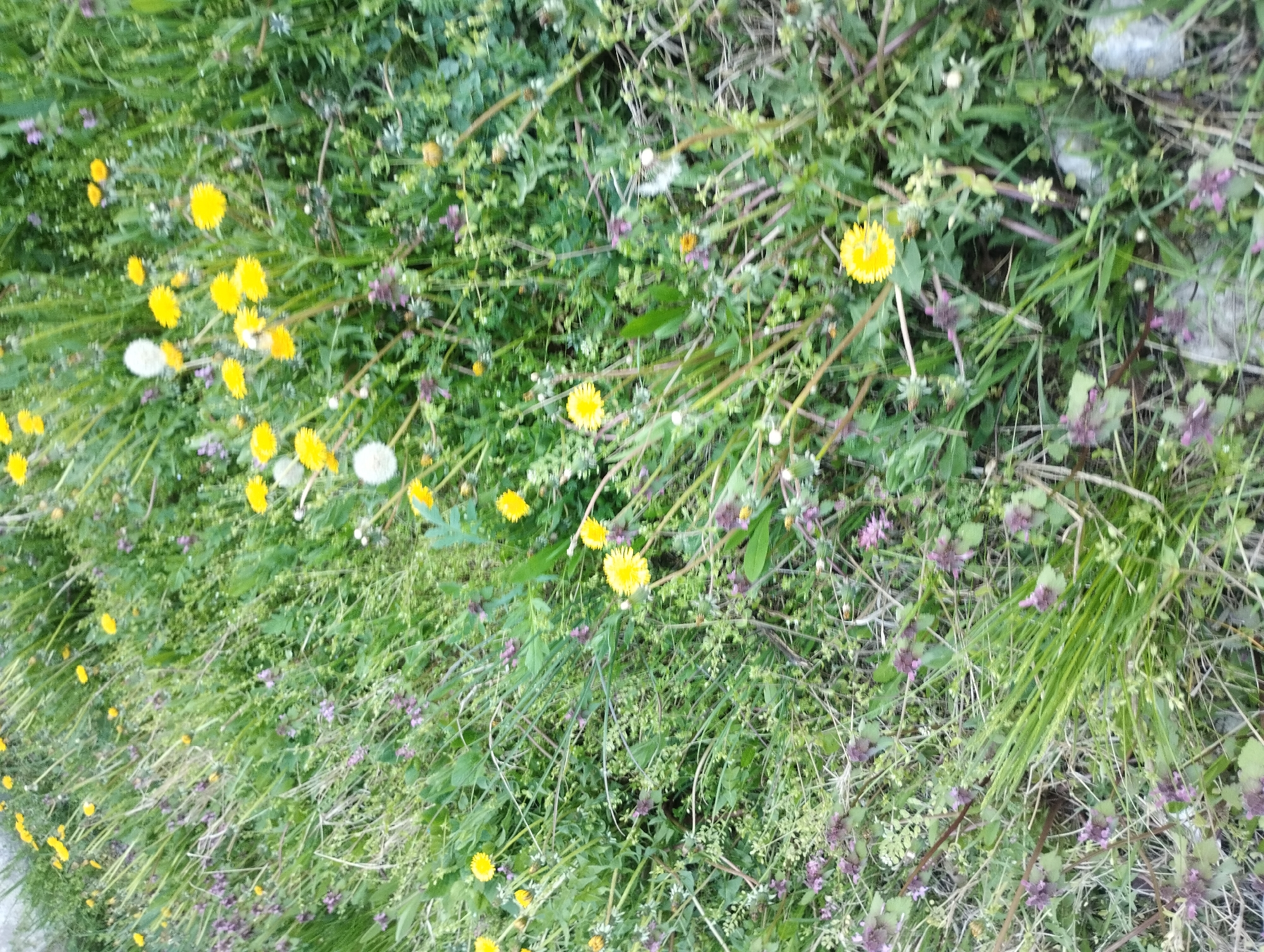patch of overgrown vegetation in Knezha, Bulgaria. There are numerous dandelions, some in full yellow bloom and others that have gone to seed with white, spherical seed heads. The dandelions are interspersed with various other weeds and grasses, some of which have small purple flowers. There is a piece of light-colored rock visible near the upper right. The area appears untended.