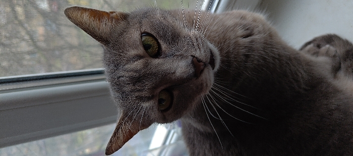 - "The image presents a close-up portrait of a domestic short-haired cat with grey fur and prominent green-yellow eyes, situated indoors on a window sill" by FM-YysAD2, licensed under CC BY 4.0