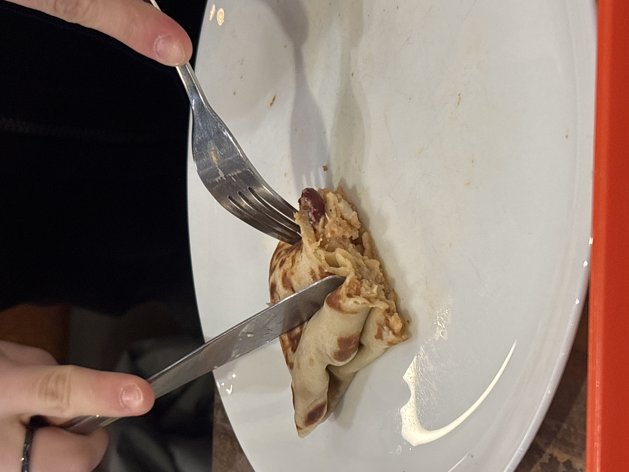 A person is using a knife and fork to cut a crepe filled with beans on a white plate. The plate is resting on a wooden surface. A red object is on the right side of the plate. The location is unknown.