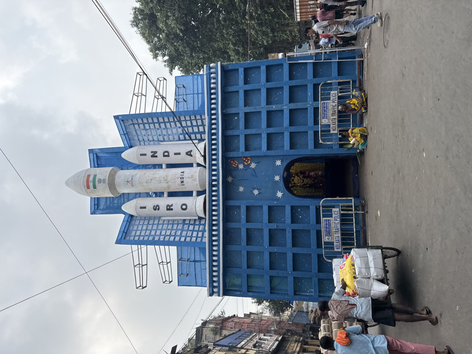 The image depicts a bustling street scene in Kolkata, India, centered around a large, temporary blue structure serving as a festival pandal. This structure is designed to resemble a rocket launchpad, featuring three prominent white rocket models on its upper tier. The central, larger rocket displays the Indian flag near its apex and the word "INDIA" below it. The smaller rocket on the left is labeled "ISRO," and the one on the right is labeled "INDIA." The lower portion of the pandal is blue with a grid-like pattern and celestial star and small rocket motifs, culminating in a central arched entrance where a brightly decorated deity figure, likely a Durga idol, is visible. The street is paved. In the foreground on the left, two men walk towards the left; one is pushing a two-wheeled handcart piled high with white sacks, while the other walks alongside him. Blue metal barriers, clearly labeled "KOLKATA TRAFFIC POLICE," line the street in front of the pandal's entrance. Behind these barriers, two women are seated on the ground. On the right side of the street, multiple pedestrians are observed moving, including a man in a light blue shirt and jeans walking towards the right. The background on the left reveals old, multi-story buildings lining the street. A large green tree is visible on the far right. Overhead, numerous electrical wires crisscross against an overcast sky.