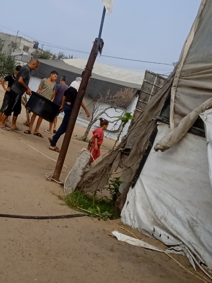 The scene depicts an outdoor environment in Al-Mawasi, Unknown, characterized by dusty, unpaved ground and makeshift structures under an overcast sky