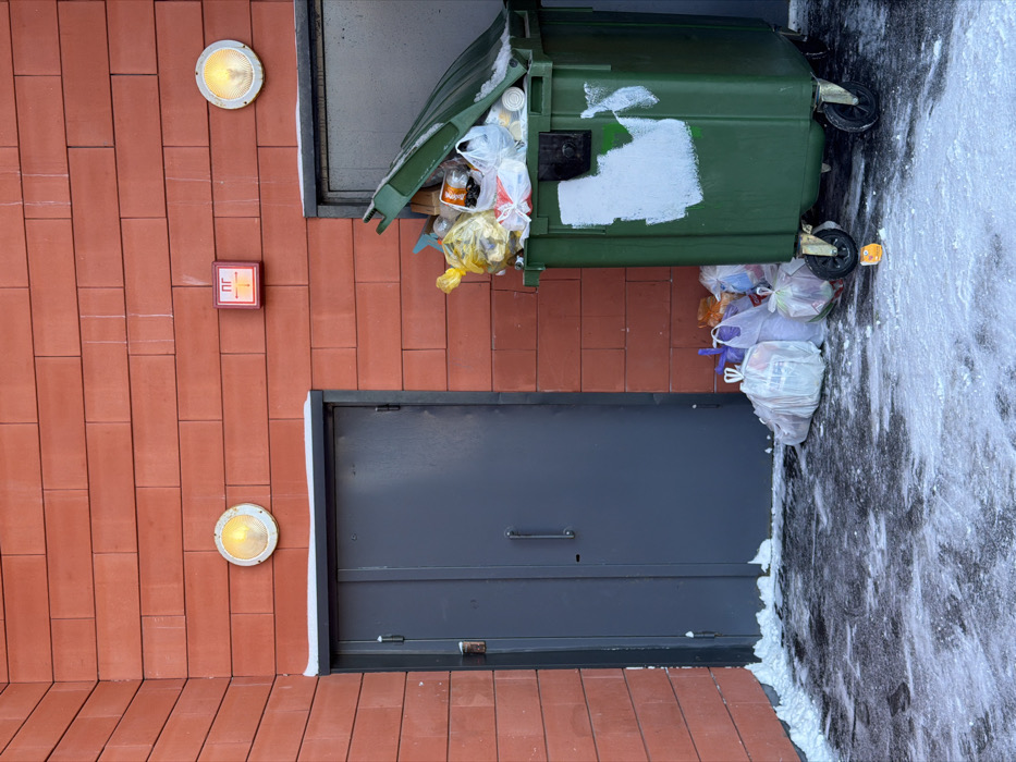 The image depicts an exterior urban scene in Sergiyev Posad, Russia, during winter conditions. A corner of a building, faced with reddish-brown rectangular tiles, dominates the background. The ground is partially covered with patches of snow and ice, interspersed with dark pavement. On the left side, a dark grey or black metal door with a vertical handle is set into the wall, flanked by a rectangular frame. Snow accumulates along the base of this door. Above this door, a circular, white-rimmed light fixture with an illuminated yellowish bulb is mounted on the wall. To the right, a large, dark green, wheeled plastic trash container stands against the wall. Its lid is open, and the container is overflowing with various trash, including yellow and clear plastic bags, cardboard, and other refuse. A significant portion of the container's right side is obscured by irregular white paint marks. Between the two light fixtures, affixed to the red wall, is a rectangular red sign with white or light-colored Cyrillic letters "ПГ" (PG) and an inverted 'T' symbol, typically indicating a fire hydrant or fire point. Another circular, white-rimmed light fixture with an illuminated yellowish bulb is visible to the right, above the trash container. On the ground, in front of the trash container and extending towards the left door, several clear and translucent plastic bags filled with trash are piled. A small, orange-colored juice box or carton lies on the icy ground near the base of the trash container. No individuals are present in the scene.