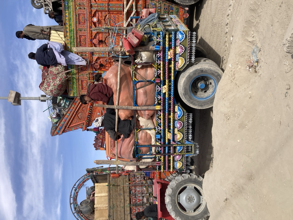 The image displays a daylight scene in Chaman City Tehsil, Pakistan, featuring two overloaded vehicles on an unpaved, dusty light-brown ground surface