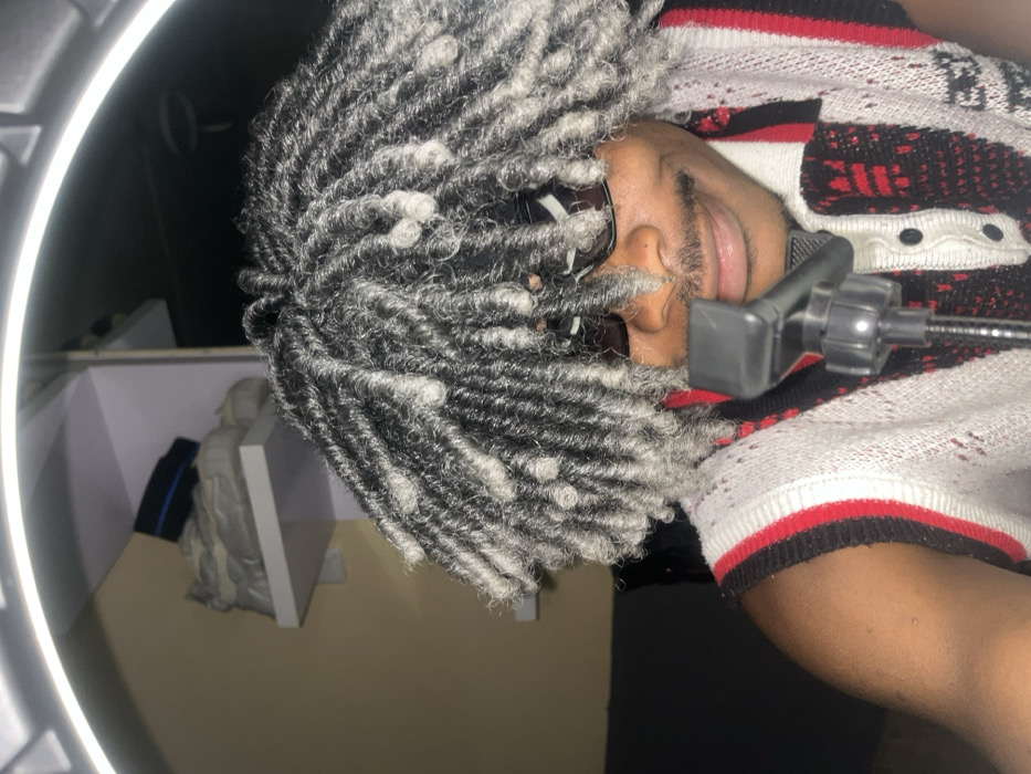 A person is positioned in front of a ring light. They have dreadlocks that are colored in shades of gray and black. They are wearing sunglasses. The person is wearing a sweater that is white, red, and black. A black adjustable phone holder is attached to the right side of their face. A partially visible shelf is behind the person.