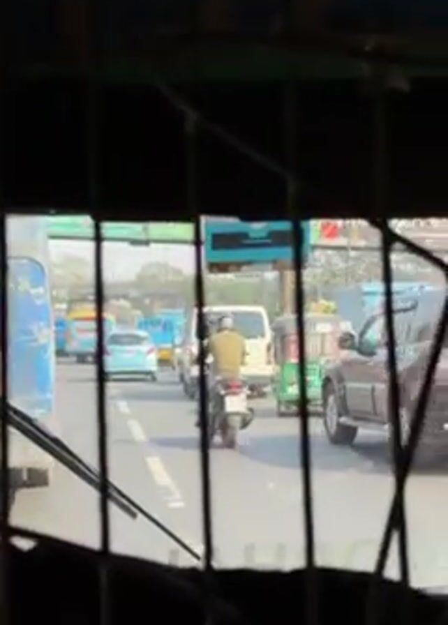 view of traffic from inside a vehicle with a barred window. The camera is static. The scene is daytime, with a clear sky. The traffic includes buses, cars, vans, motorcycles, and auto rickshaws. There are some people on motorcycles. The scene appears to be in an urban area, with billboards visible in the background. The traffic is heavy and moving slowly.