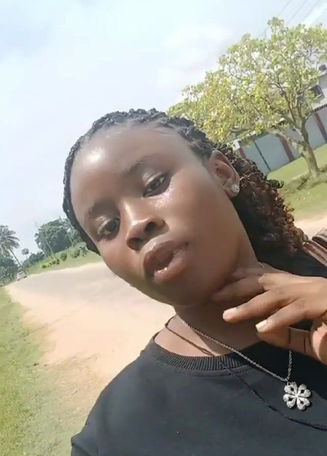 A woman is seen in a selfie-style video outside on a sunny day. She has dark skin, braided hair with some curly pieces, and is wearing a black long-sleeved shirt with a silver necklace that has a flower pendant. The woman makes brief gestures with her hands, including holding her hair and making a peace sign. The background consists of a paved path, green grass, trees, and buildings in the distance. The camera is relatively stable but shows minor movement.