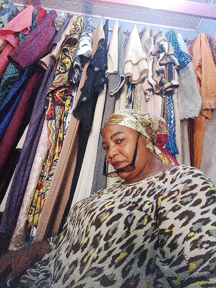 The image displays an indoor scene in Narayi, Nigeria, featuring a woman centrally positioned within what appears to be a clothing store