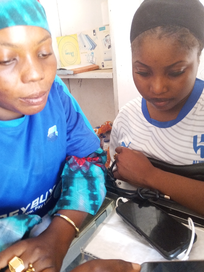 Two adult females are positioned in an indoor setting within Fagge C, Nigeria, likely a retail or service establishment