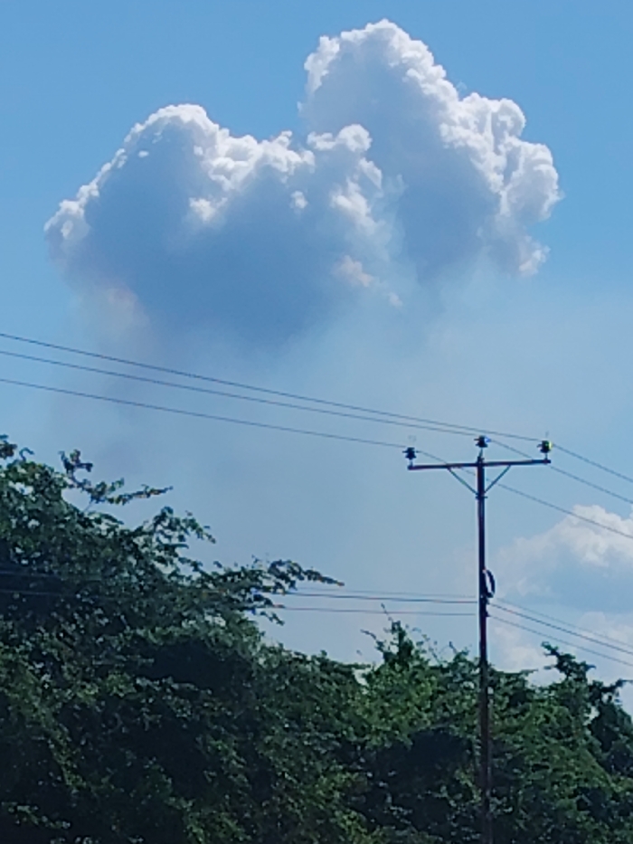 A large cumulus cloud dominates a bright blue sky. Below, dense green foliage covers the lower portion of the scene. An electrical pole stands amidst the trees, with power lines stretching across the frame horizontally. Another small cloud is seen in the background on the right. The photo captures a clear day with a mix of natural and man-made elements.