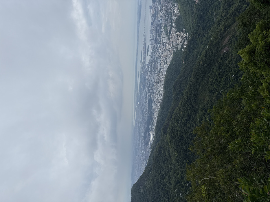From a high vantage point, a vast cityscape stretches towards the horizon under a cloudy sky. A large body of water separates the city from distant land, a bridge spanning the divide. Lush green vegetation covers the steep slopes in the foreground, contrasting with the urban sprawl. The overall scene is slightly hazy due to atmospheric conditions.