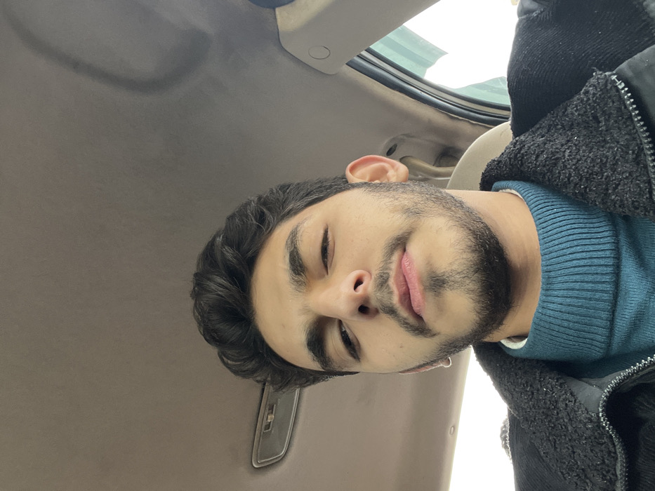 A young adult male is depicted in a close-up, head-and-shoulders portrait, appearing to be a selfie taken within a vehicle