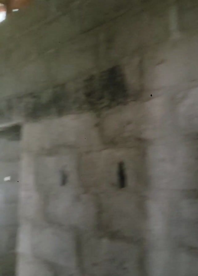 rough concrete ceiling with a visible crack and some discoloration. The camera moves, showing a wall with a small, bright opening, possibly a window, and then returns to the concrete.