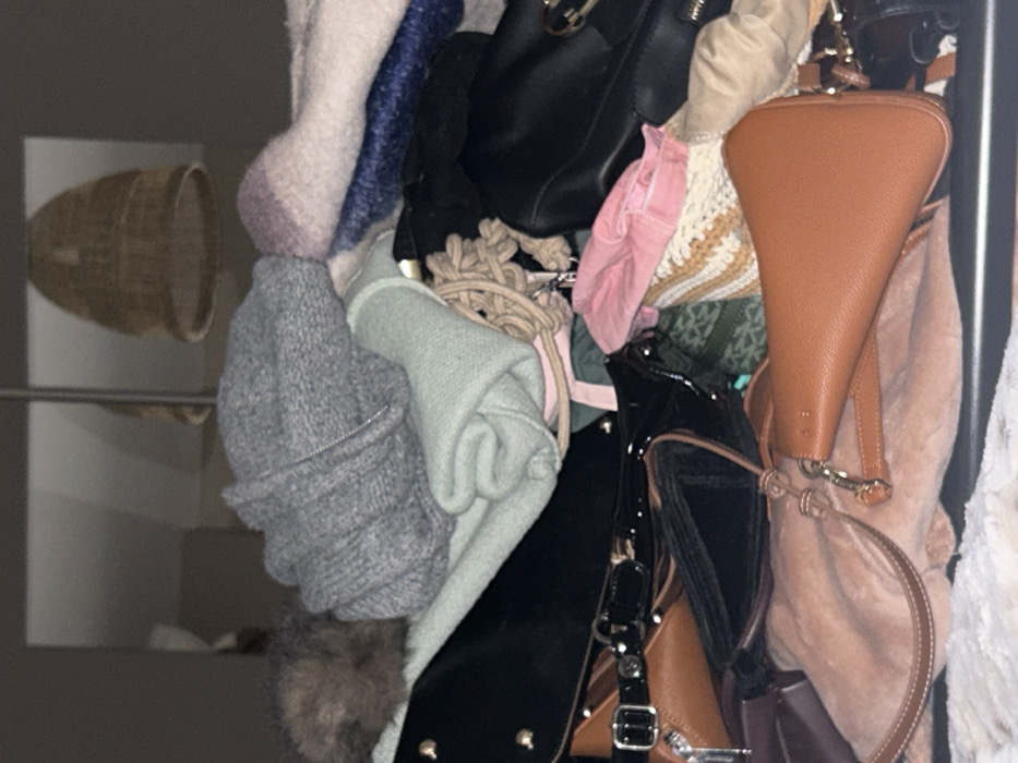 A cluttered assortment of hats, scarves, and purses fills a space. Knitted hats in grey, blue, and pastel green sit beside handbags of brown leather, black patent, and plush tan fabric. A woven lampshade is slightly out of focus in the background, and a small patch of brown fur is also visible. Straps, buckles, and decorative hardware are partially obscured by other items.