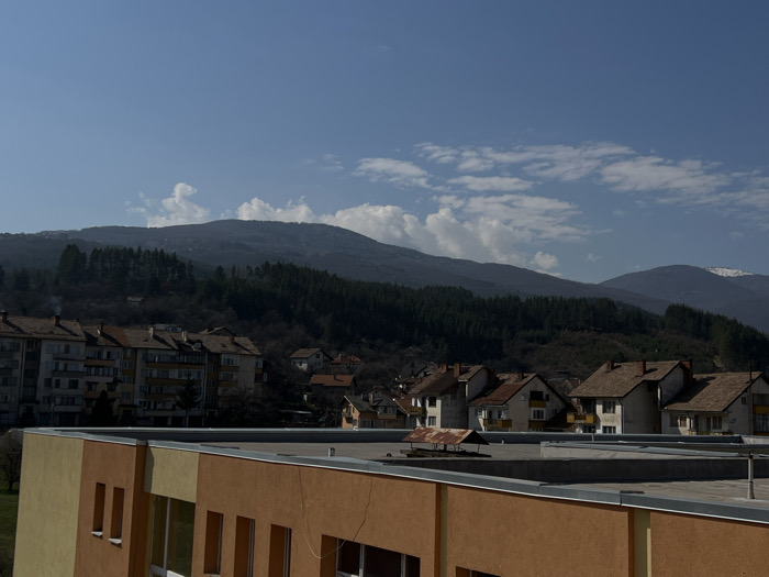 The image depicts an elevated view of a residential area in Kyustendil, Bulgaria, against a backdrop of mountains under a clear blue sky. In the immediate foreground, the top section of a building with a flat, dark gray roof is visible, displaying an orange-brown facade on the right and a lighter yellow-orange section on the left, featuring multiple rectangular window openings and vertical recessed panels. The midground reveals a cluster of residential structures. On the far left, a multi-story apartment building with a light-colored facade and a reddish-brown tiled roof shows a faint plume of smoke rising from a chimney. To the right, a row of detached or semi-detached houses with similar reddish-brown tiled roofs, light-colored walls, and yellow balcony railings are present. A small, rusty metal structure with a pitched roof is situated on the flat roof of a building within this section. The background is dominated by a substantial mountain range, densely covered with dark green coniferous forests. The higher peaks of the range are visible, with the furthest peak on the right displaying patches of white, indicative of snow or exposed rock. The sky above is clear and blue, dotted with scattered white cumulus clouds. The scene is illuminated by natural daylight. No individuals or specific actions are discernible.