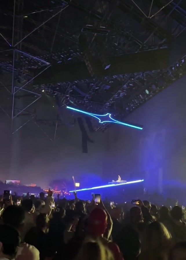 A music event unfolds inside a large, high-ceilinged structure with a visible geometric framework overhead