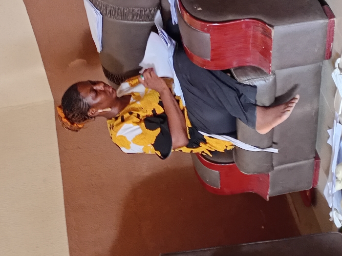 A woman wearing a yellow, white, and black patterned top with black pants is seated on a gray couch with red accents. She holds papers in her hand, appearing to read or study. The room has a light brown floor and walls. Part of a second, possibly identical, couch is visible next to the one she is seated on. Additional papers are scattered around the couches.