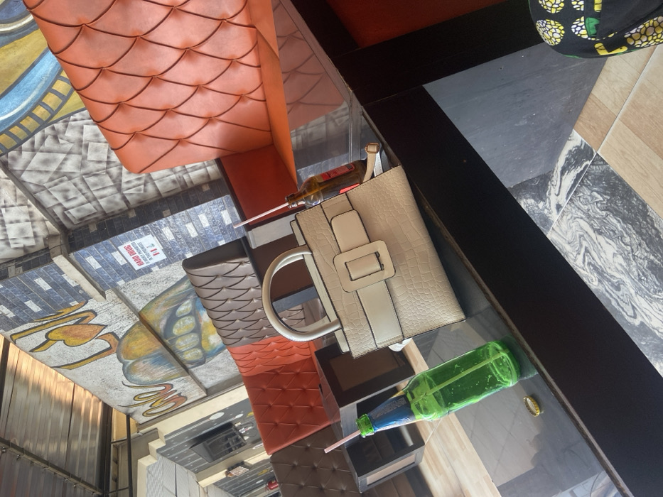 The image depicts the interior of a commercial establishment in Nsukka, Nigeria, presenting a dark, reflective table in the foreground. Positioned on the table are a light beige handbag with a crocodile texture and a large square buckle, a green glass bottle containing a clear liquid with a pink straw, and a brown glass bottle with a white straw. A gold bottle cap is situated near the green bottle. A partial view of a person's lower leg, clad in black fabric with yellow and green patterns, is visible at the bottom right. The floor exhibits a pattern of light brown and grey marbled tiles. In the midground, several upholstered booth seats are arranged, featuring orange tufted sections and brown padded seating. The background wall is adorned with a large, multi-colored mural displaying abstract forms and stylized text. A white sign affixed to the wall reads, "HARD DRUG IS HIGHLY PROHIBITED IN THIS PREMISES." Overhead, an exposed ceiling structure with metal beams is visible. No individuals are clearly identifiable, and no active interactions are depicted.
