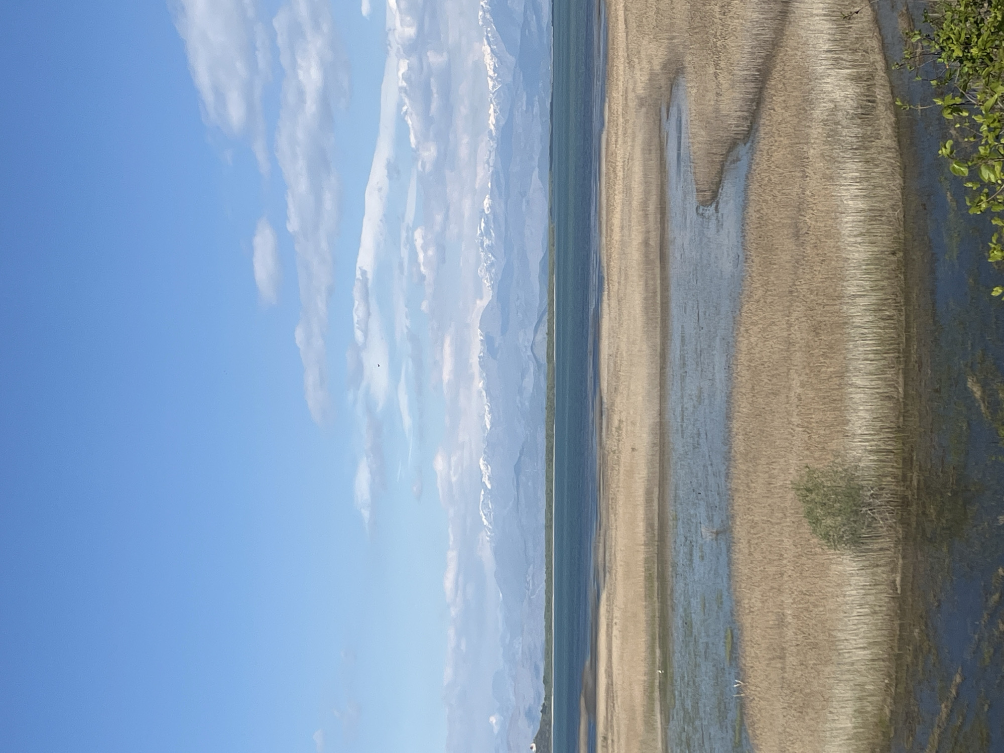 horizontal view of a coastal landscape. On the left is a clear blue sky with scattered white clouds. Adjacent to the sky is a view of distant mountains, some with snow-capped peaks. Next to the mountains is a narrow strip of water, possibly a sea or bay. To the right of the water is a sandy beach or mudflat, partially submerged with shallow water. There is some vegetation visible on the right side of the image. The location is Boljevići, Montenegro.