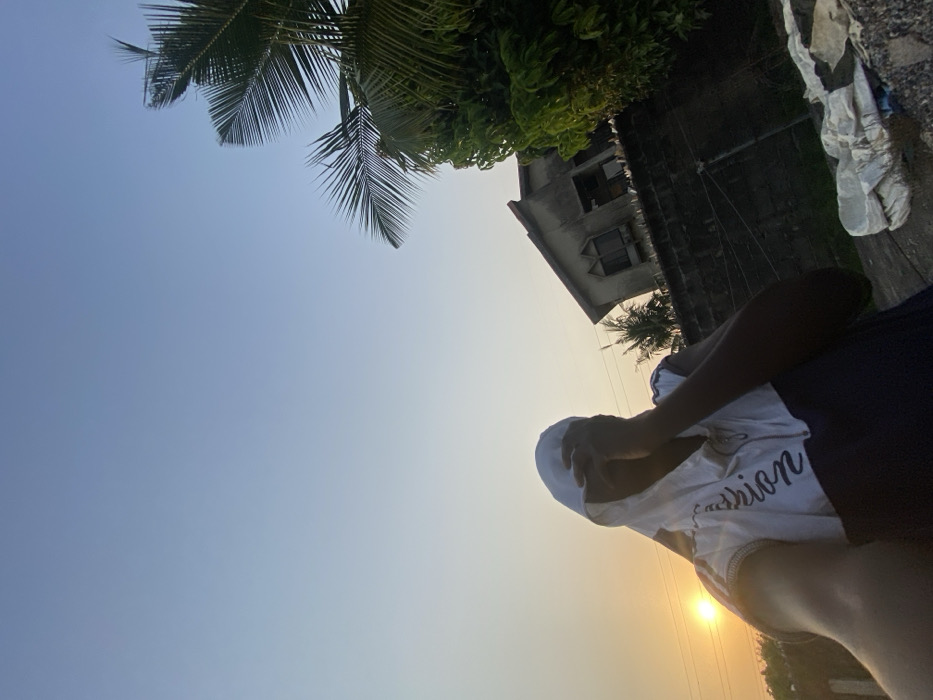 The image depicts an outdoor scene in Ado, Nigeria, during either sunrise or sunset, indicated by the low sun on the left horizon and the sky's orange-to-blue gradient