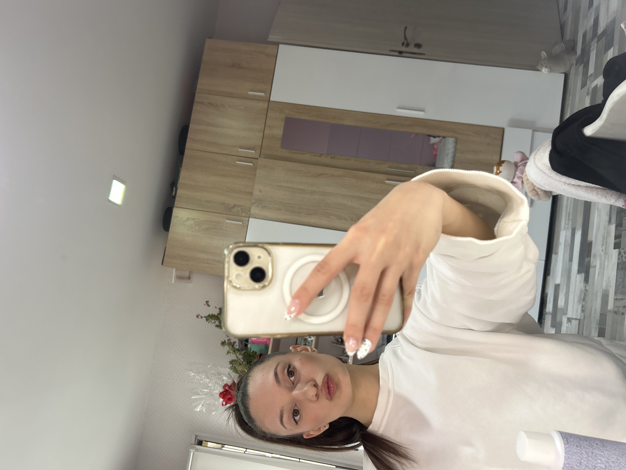 woman taking a selfie in an indoor environment. She is holding a smartphone with a white case, showing manicured nails, and is wearing a white top. In the background, there is a wardrobe with light wood-colored cabinets and white panels. A decorative item with a red flower is visible in her hair. The location appears to be a room in a home. There is no specific visual element identifying the city of Pernik, Bulgaria.