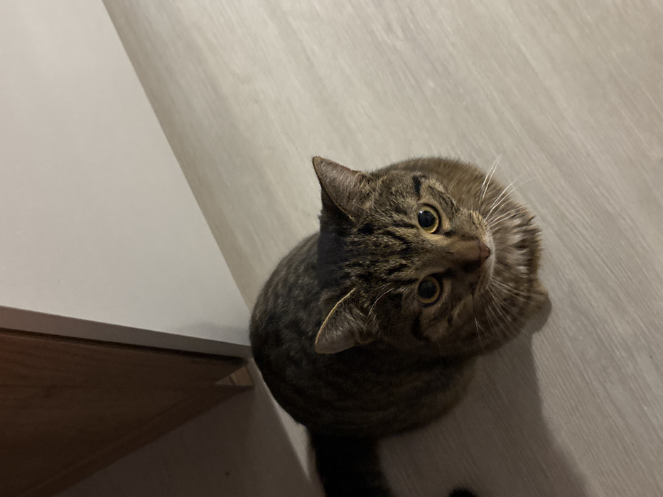 - "An indoor scene depicts a single domestic short-haired tabby cat, exhibiting brown, black, and tan striped fur patterns, positioned centrally on a light-colored, wood-patterned floor" by FM-UOwZk1, licensed under CC BY 4.0