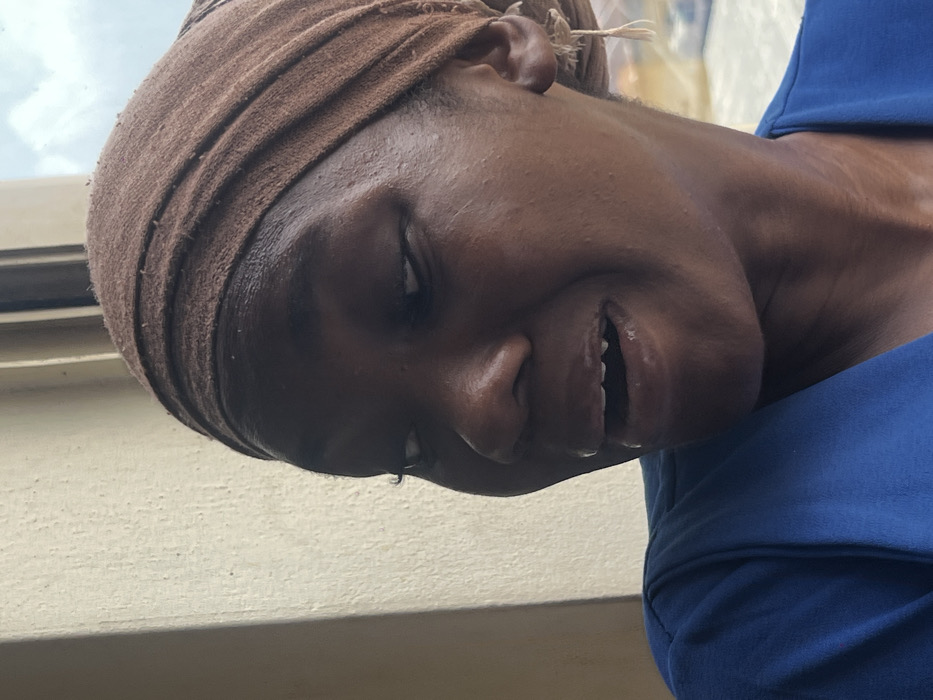 The image, taken in the city of Egan, Nigeria, shows a close-up of an adult female with dark skin, visible from the chest up