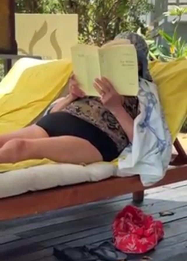 A woman lies on a yellow lounge chair on a wooden deck outdoors, reading a book titled "La Vallée des Peintres