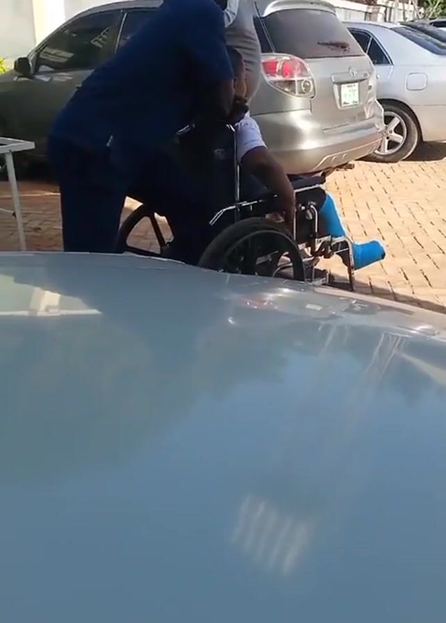 Two individuals are assisting a person in a wheelchair across a brick-paved area in an outdoor setting. The person in the wheelchair has a blue cast on their left leg. One individual, wearing blue scrubs and a surgical cap and mask, is pushing the wheelchair from behind. Another person is standing next to the wheelchair. Several cars are parked in the background, and a partial view of a car is in the foreground. The sky is clear and the scene is well-lit.