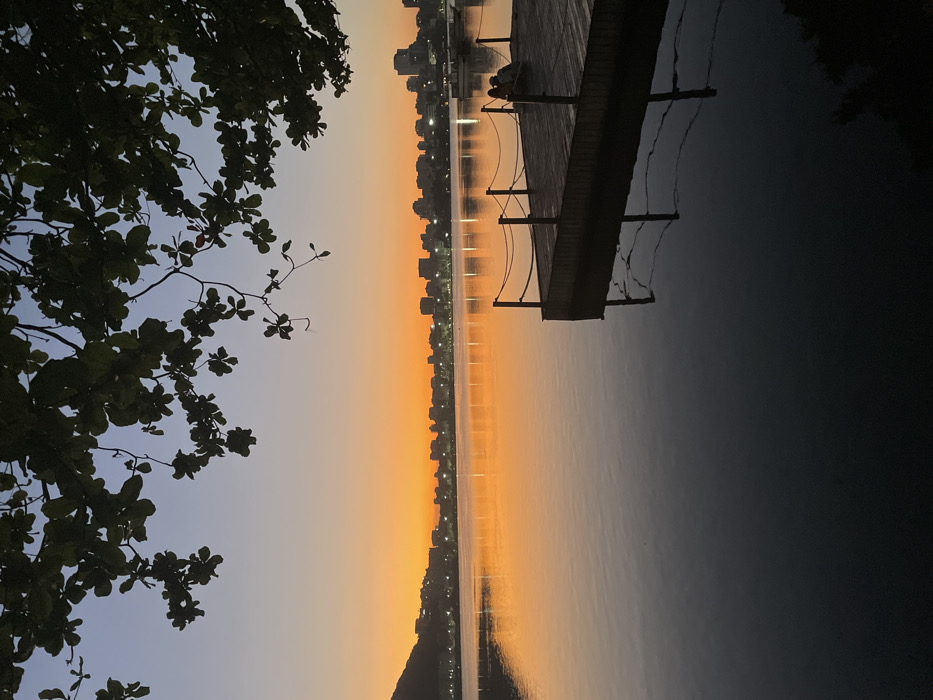 A serene landscape displays a tranquil body of water reflecting a vibrant sunset gradient of orange and yellow. A cityscape aligns the distant horizon, its lights mirrored in the water. A wooden dock protrudes into the lake. Lush foliage occupies the left corner. The right side of the water is dark, transitioning to a calm reflection closer to the center.