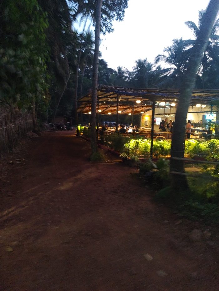 This image captures a semi-outdoor restaurant or cafe located in Querim, India, during twilight hours