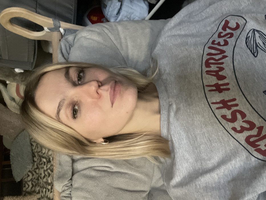 The image depicts an adult female subject in an indoor, domestic setting. The specific location within Moscow, Russia, cannot be determined from the visual information provided. **Subject:** A female with light blonde, shoulder-length hair and light-colored eyes. She has a neutral expression and is looking directly at the camera. She wears small, circular hoop earrings, possibly adorned with small stones, in her left ear, with the right ear not fully visible. **Attire:** She is wearing a grey, long-sleeved sweatshirt. The front of the sweatshirt features a graphic design with red lettering forming an arc that reads "FRESH HARVEST." Below this text, a faint outline of a natural element, possibly a mushroom, is visible. **Environment and Objects:** The subject is leaning against a light grey, soft surface, likely a pillow or cushioned backrest. The background to her left features a patterned textile, possibly a blanket or cushion, with a grey and dark grey geometric design, and a light-colored plush item. To her right, a light-colored wooden object with a curved, handle-like design, resembling part of a high chair or baby bouncer, is visible. Below this wooden object, a red item and crumpled light-colored fabric are also present, indicating a somewhat cluttered room. The lighting appears to be ambient indoor light. No explicit actions or interactions beyond the subject presenting for the camera are evident.