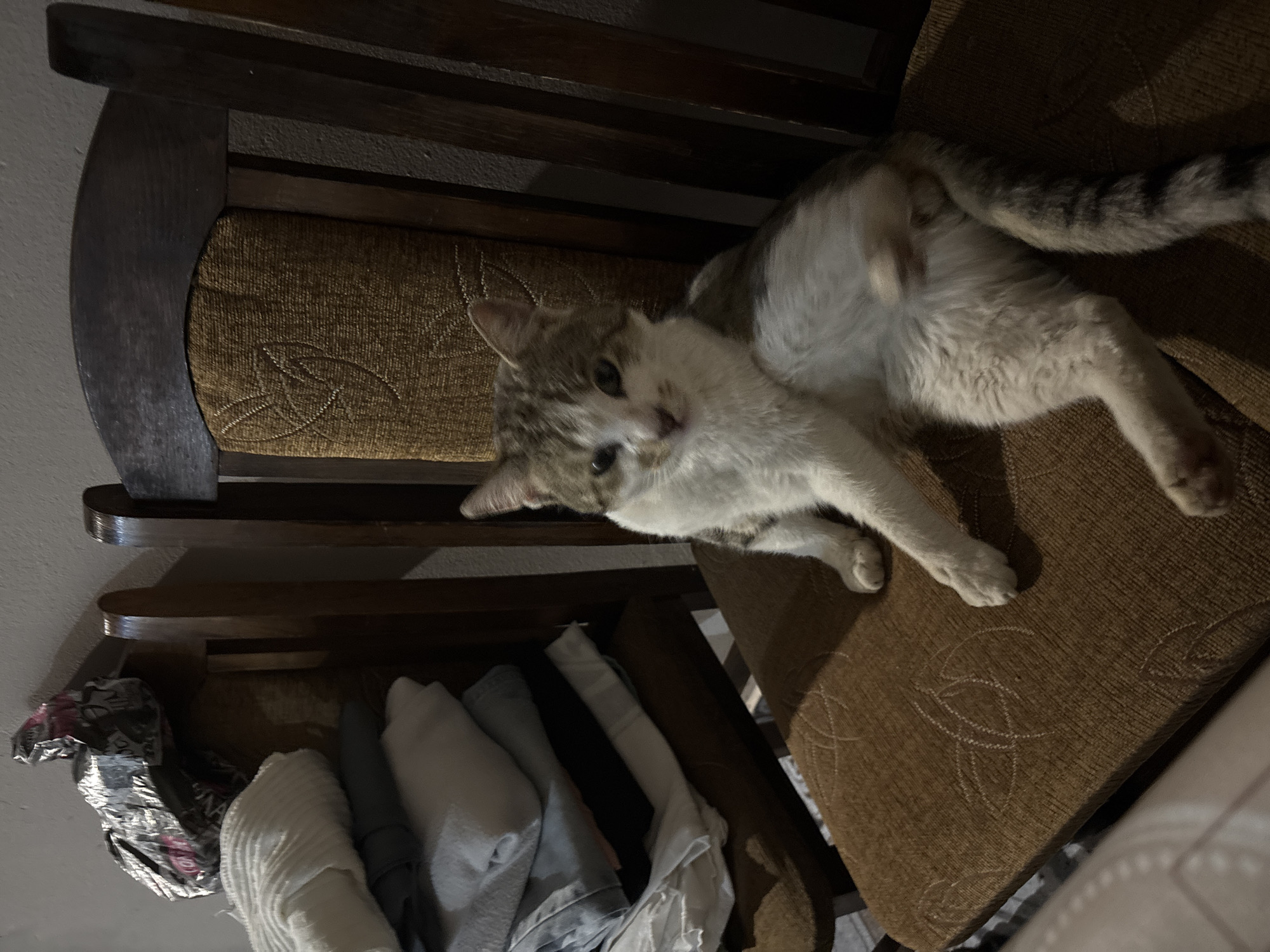 A white and grey tabby cat lies on a brown cushion-covered chair. The chair has a wooden frame. Beneath the chair seat, an assortment of folded laundry and a shopping bag are visible. The image was taken indoors. Slavyanovo, Bulgaria is not discernible from the image.