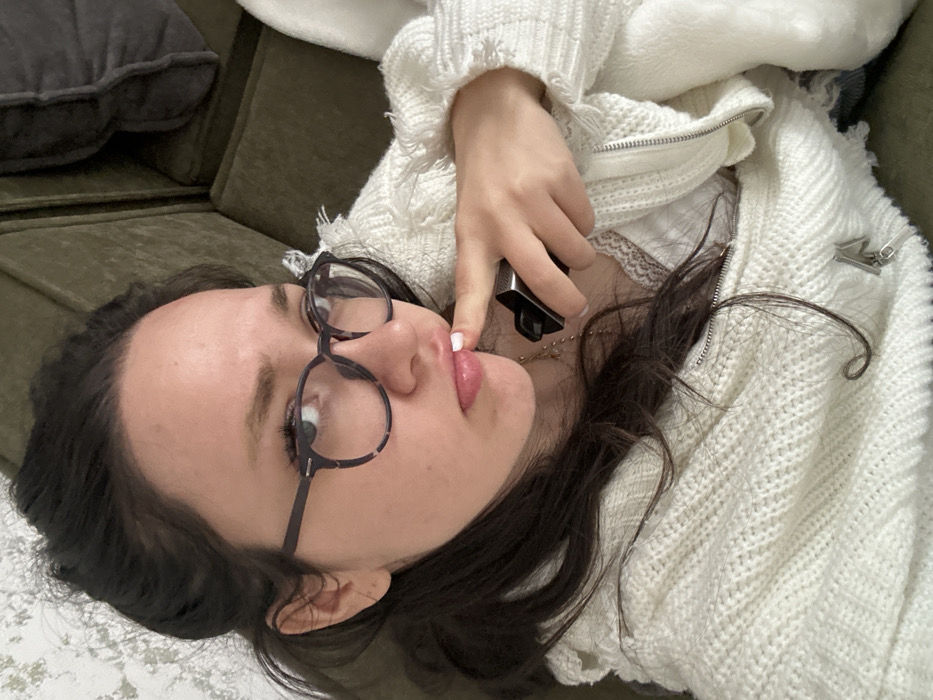 The image features a female individual reclining indoors on an olive green upholstered couch or armchair. She has dark hair, partially pulled back, and wears dark-rimmed glasses. Her eyes are directed upwards and to the viewer's right, with her mouth slightly open and lower lip pouting. She wears a light-colored, possibly off-white, knitted zip-up cardigan over a white lace-trimmed top. A gold-colored chain necklace with a small pendant is visible. Her left index finger, with a white painted nail, is positioned against her lower lip. Her right hand holds a small, dark-colored, rectangular object, possibly an electronic vaping device or a lighter. In the background, a light-colored wall with a subtle texture is visible to the upper left, and a white, fluffy object (possibly a blanket or pillow) is partially visible on the right. The specific location within the city of Yerevan, Armenia, is not discernible from the visual information provided in the image.