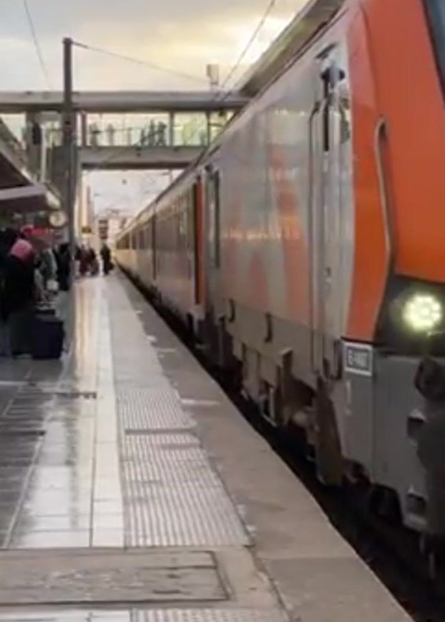 train at a station. The train is orange and white with the letters "ONCF" on the side. People are standing on the platform next to the train, waiting to board. The platform is wet, and there is a covered walkway above the tracks with people walking across. The sky is cloudy and overcast.