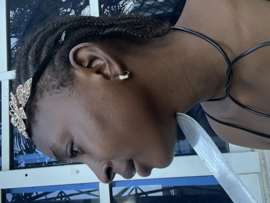 A dark-skinned individual, appearing to be a young female, is depicted in profile facing left in Lokoja, Nigeria. The subject wears dark braided hair, with a decorative, rose-gold toned, gemstone-studded butterfly-shaped headband on the forehead and a small black hair clip in the hair near the ear. A small, gold-toned hoop earring with white stones is present in the visible earlobe. A black, cord-like necklace, tied with a knot, adorns the neck, above a dark, thin-strapped garment. A metallic blade, consistent with a knife or machete, is positioned directly against the underside of the individual's chin and throat, angled downwards. The background consists of a building facade with white and blue vertical structural elements, suggesting window or door frames, and reflective glass surfaces.
