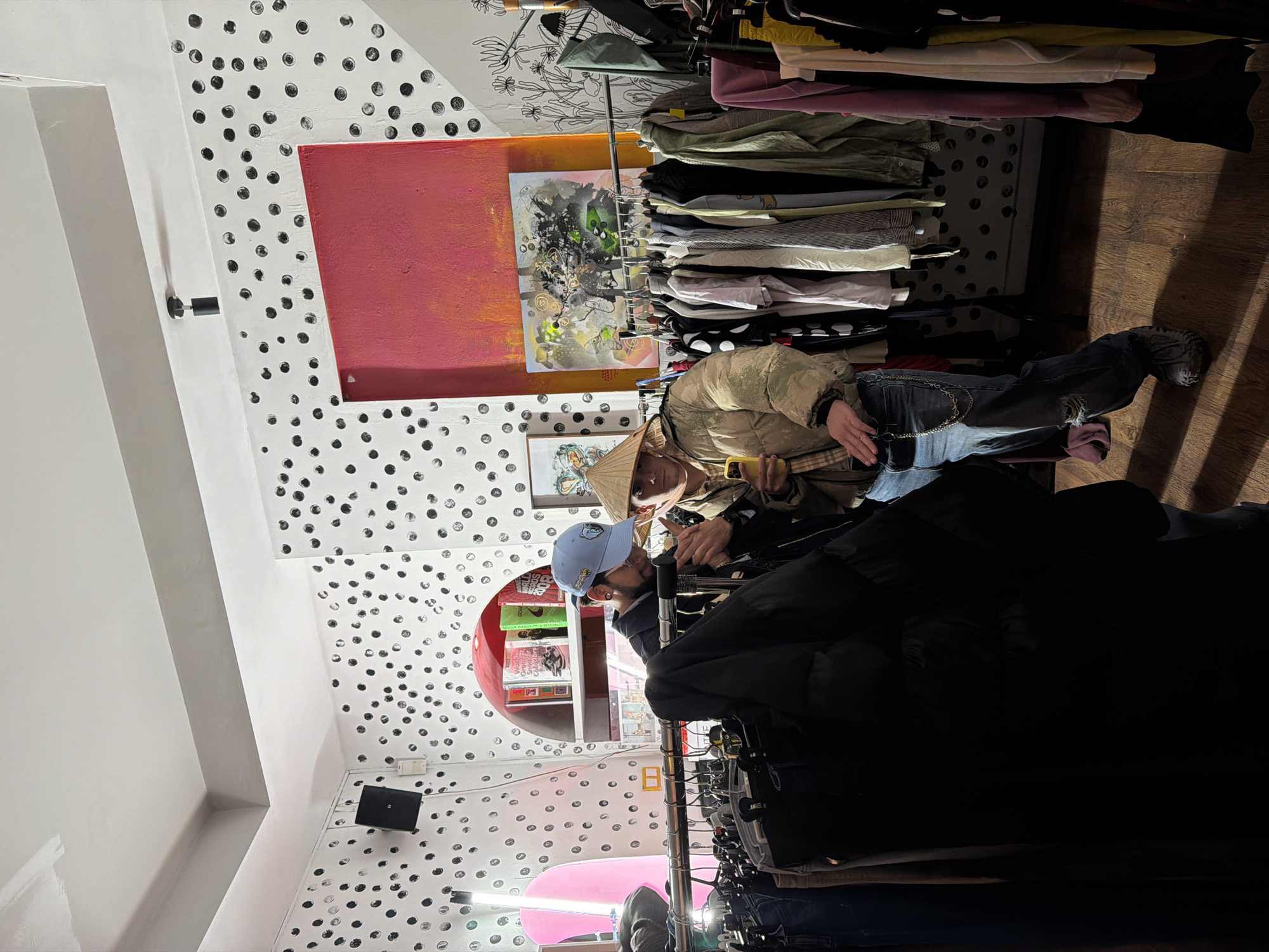 Two people are shopping in what appears to be a clothing store, based on the racks of clothes in the foreground and background. One person wears a blue baseball cap and looks at a rack of clothes. The other, partially obscured, wears a traditional Asian conical hat and uses a mobile phone. The store's walls are decorated with white paint and black polka dots, and art hangs on the walls. The clothing racks are full. The store appears to be in Sofia, Bulgaria.
